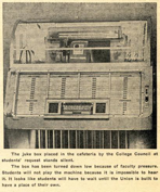 (Caption reads: The juke box placed in the cafeteria by the College Council at students‟ request stands silent. The box has been turned down low because of faculty pressure. Students will not play the machine because it is impossible to hear it. It looks like students will have to wait until the Union is built to have a place of their own. – Nor’Wester, January 19, 1962)
