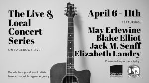 The Live & Local Concert Series is presented by the Dennos and Crosshatch Center for Art and Ecology to bring some much needed musical entertainment to your living room. We believe strongly in supporting our local musicians, and invite you to join us on Facebook Live to do the same. Featuring four local singer-songwriters, this could be the beginning of an ongoing series, so stay tuned. You can also visit crosshatch.org/emergency to support their local artist relief fund.