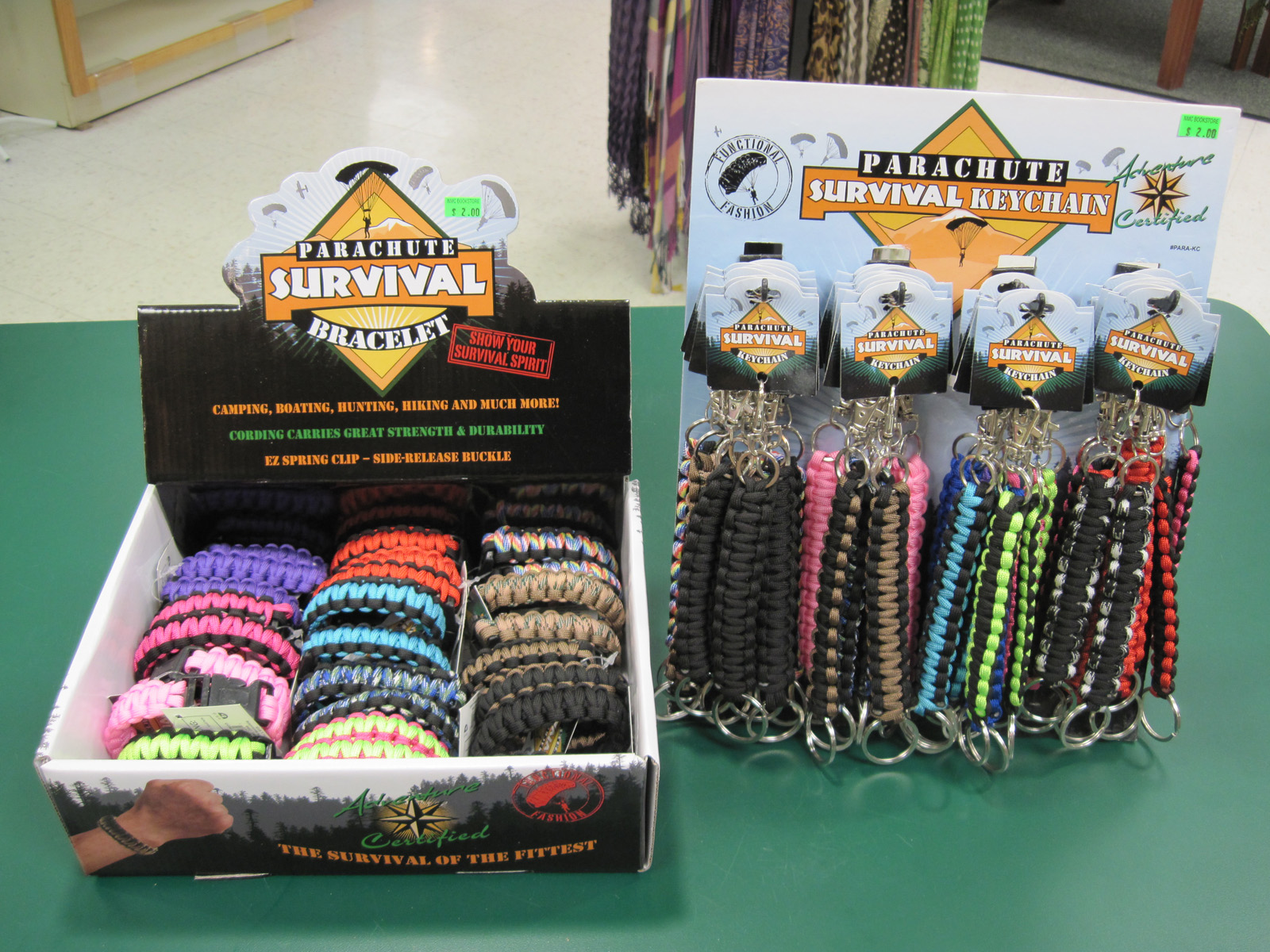Survival Items: This hottest new item comes in a key chain or bracelet. They are made from parachute cord. If unraveled in survival situations they provide 50 ft of cord. Retail $ 2.00