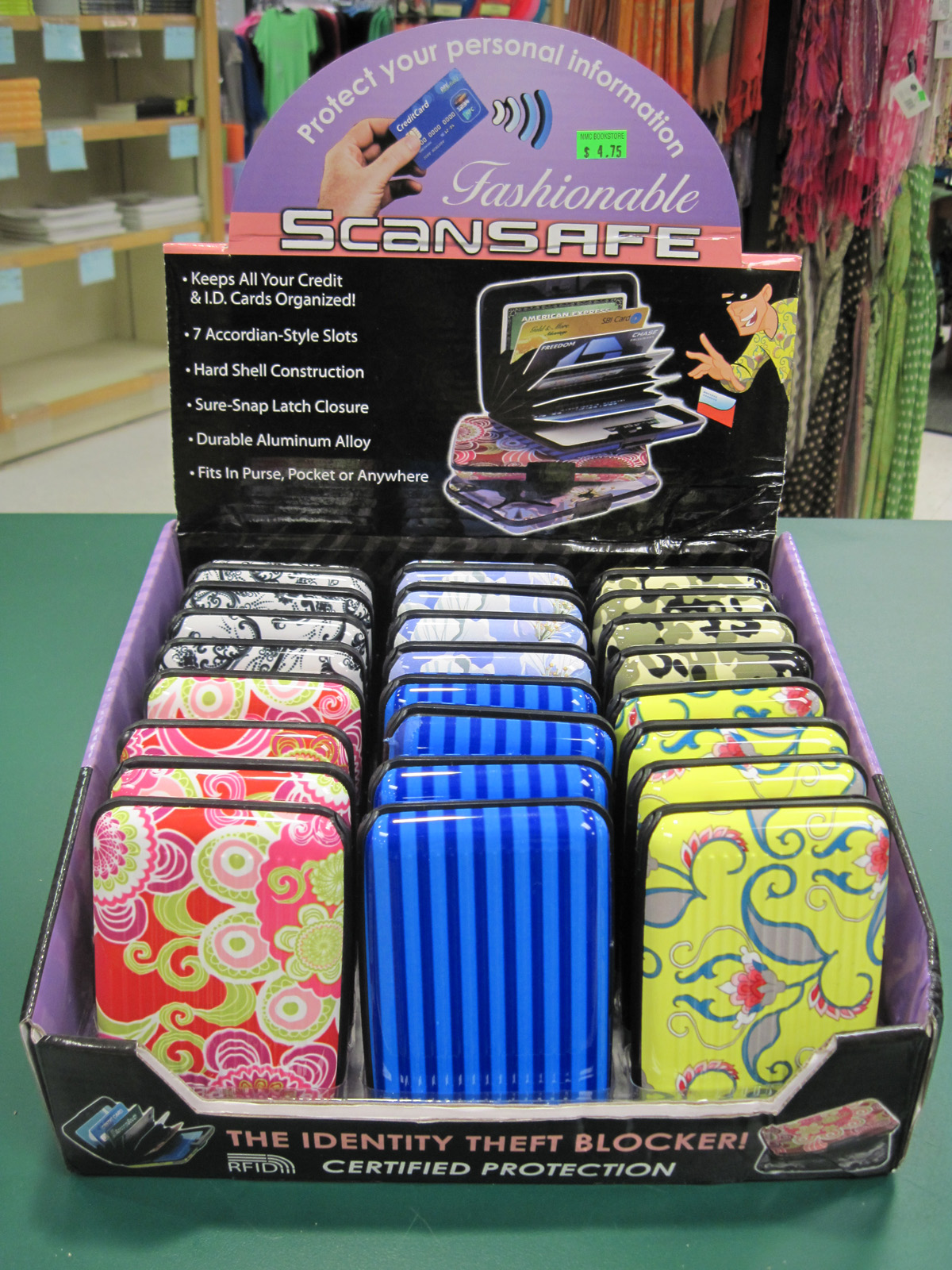 Scan safe wallets: Made from a material to prevent thieves from scanning your credit card numbers. Retail $4.75.