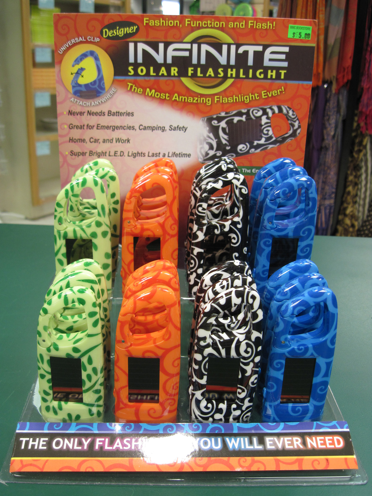 Flashlight: This flashlight requires no batteries. Recharge in direct sunlight or using incandescent light. Clips to purses, belt loops, book bags. Retail $ 5.00