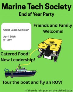 The Marine Technology Society is hosting a party to celebrate the end of the year from 5–7 p.m. on Wednesday, April 30 on the pier at the Great Lakes Campus. Come tour the boat, operate an ROV and enjoy some food! In the event of inclement weather, the party will be held indoors at the Makerspace in the Parsons-Stulen Building.