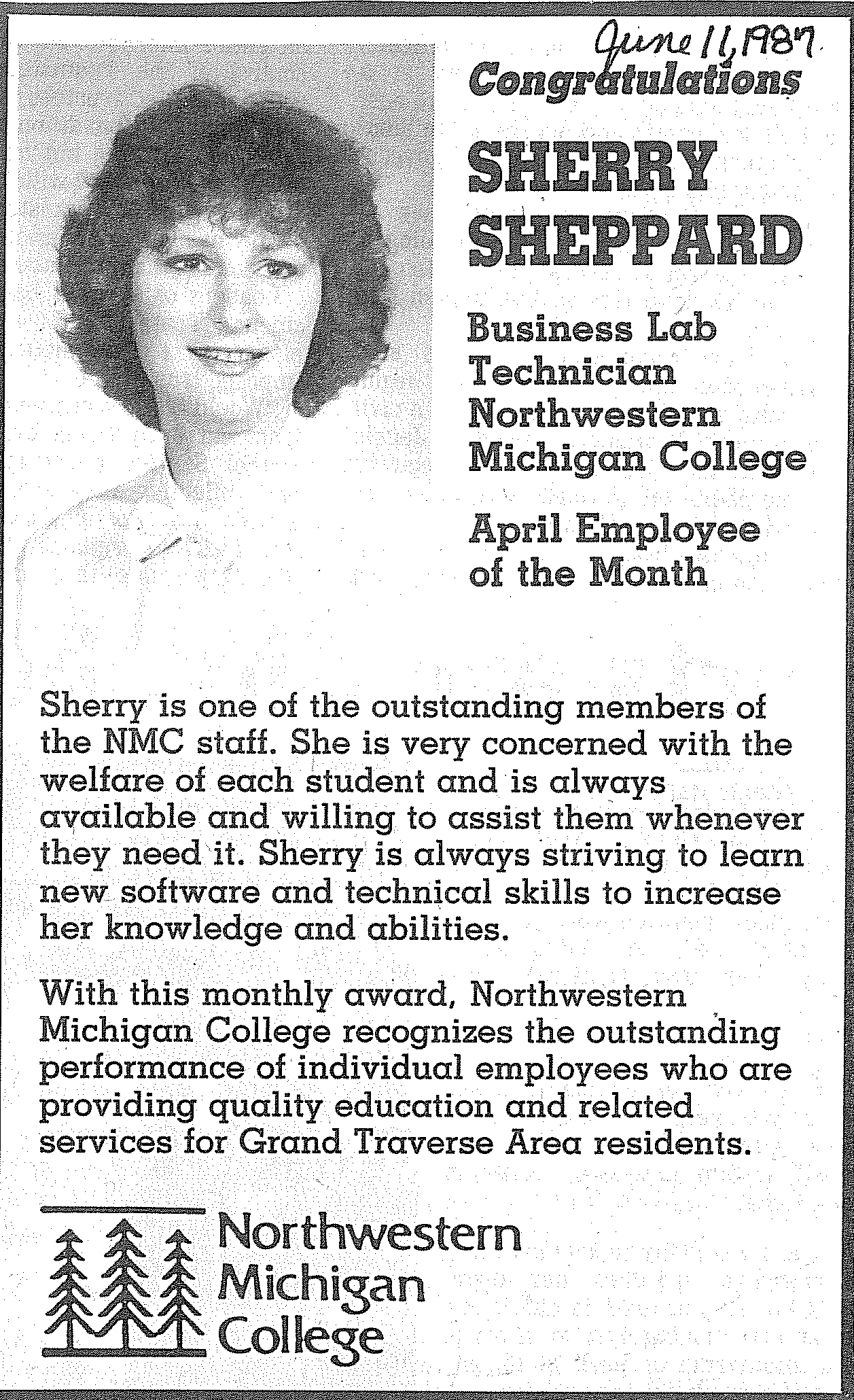 Sherry Sheppard [Howard] was announced in the Record-Eagle as the NMC Employee of the Month for April.