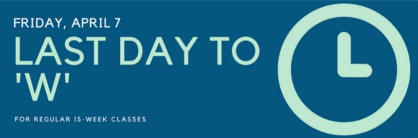 This Friday, April 7 is the LAST DAY for your students to drop regular 15-week classes. Please encourage those students in your classes who may benefit from exercising this option to check with Student Financial Services prior to dropping. Dropping by Friday means the student receives a ‘W’ on their academic transcript instead of a grade for the class. Questions? Contact a professional advisor in the Advising Center at 5-1040. Thank you!