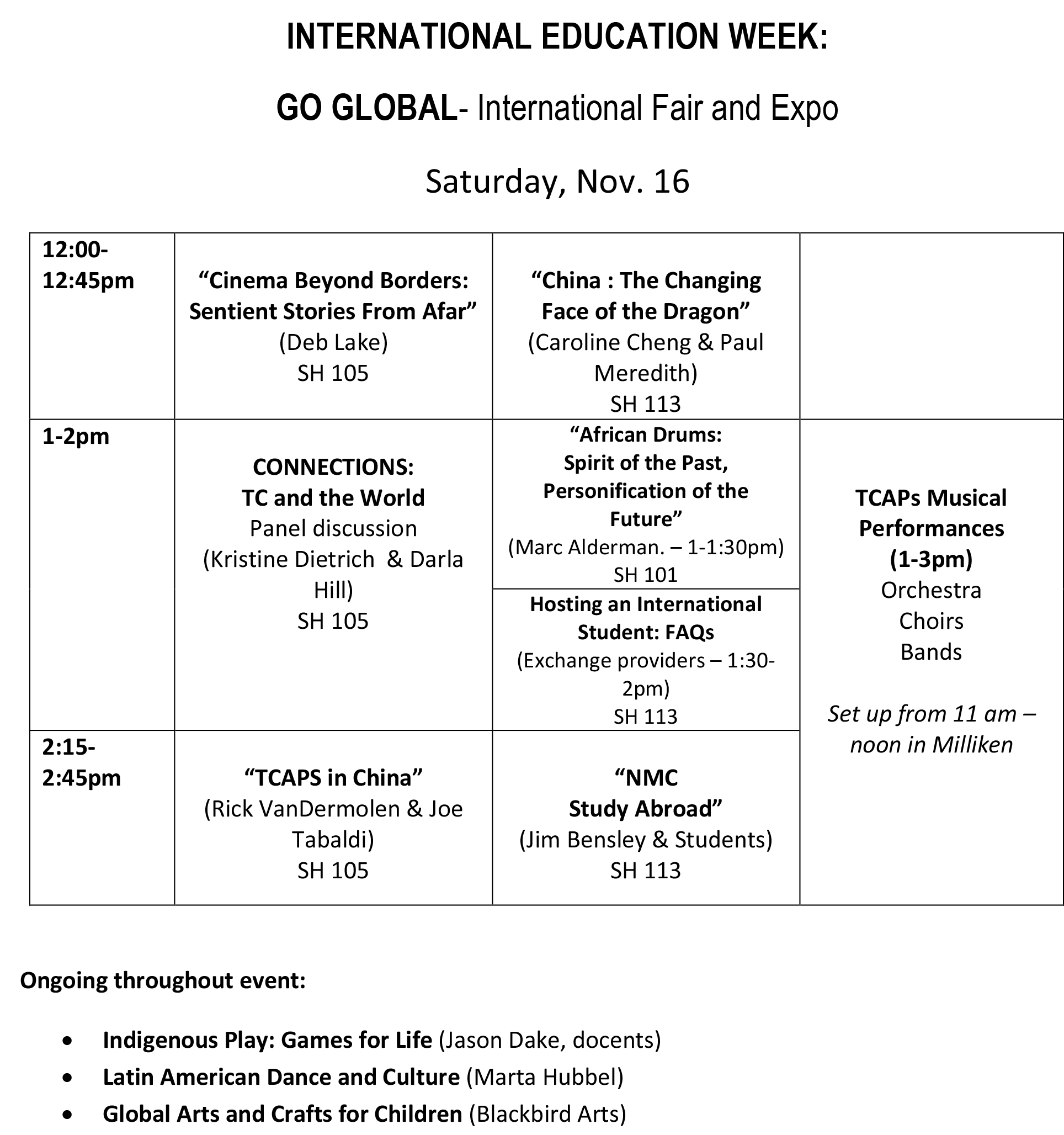 As part of International Education Week, the Go Global Fair and Expo will be held at the Dennos Museum and Scholars Hall on Saturday, Nov. 16. It will include food, displays, breakout sessions, musical performances and more.