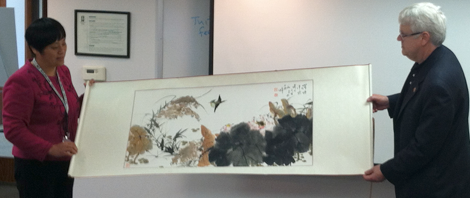 VELT delegate YunXia Li, Vice President of Yunnan Jiaotong College, presents NMC president Timothy J. Nelson with a gift from her school.
