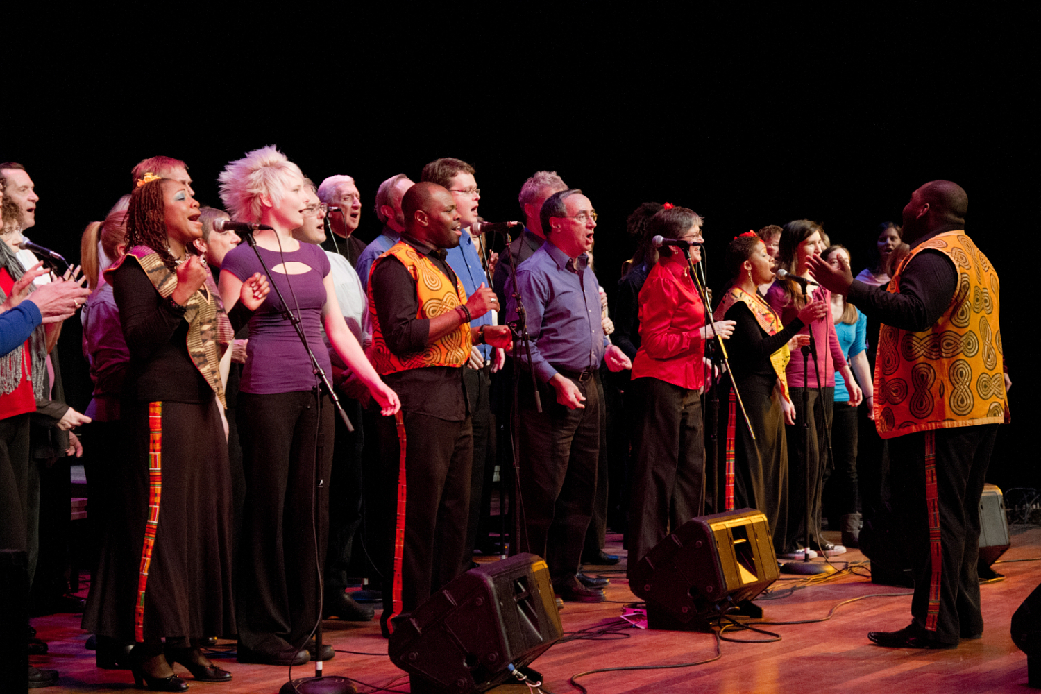A choir made up of member of the NMC Grand Traverse Chorale and the NMC Chamber Singers, about 45, participated in a workshop with the Harlem Gospel Choir. During the workshop, the HGC talked to about their history, their approach, and their mission. We talked about musical singing styles – specifically gospel music. They taught us the number we performed with them,“O Happy Day,” in about 20 minutes. It was a great experience for the choirs!